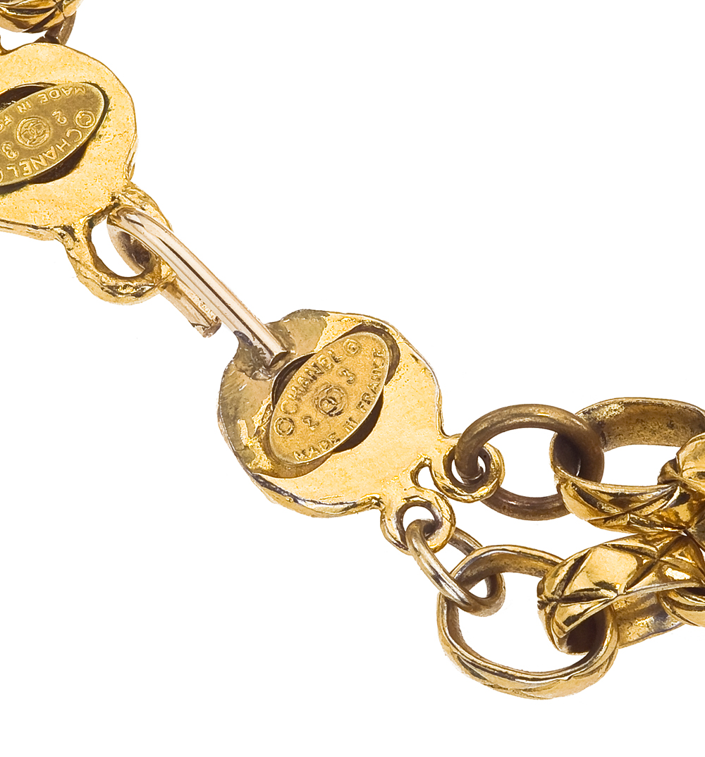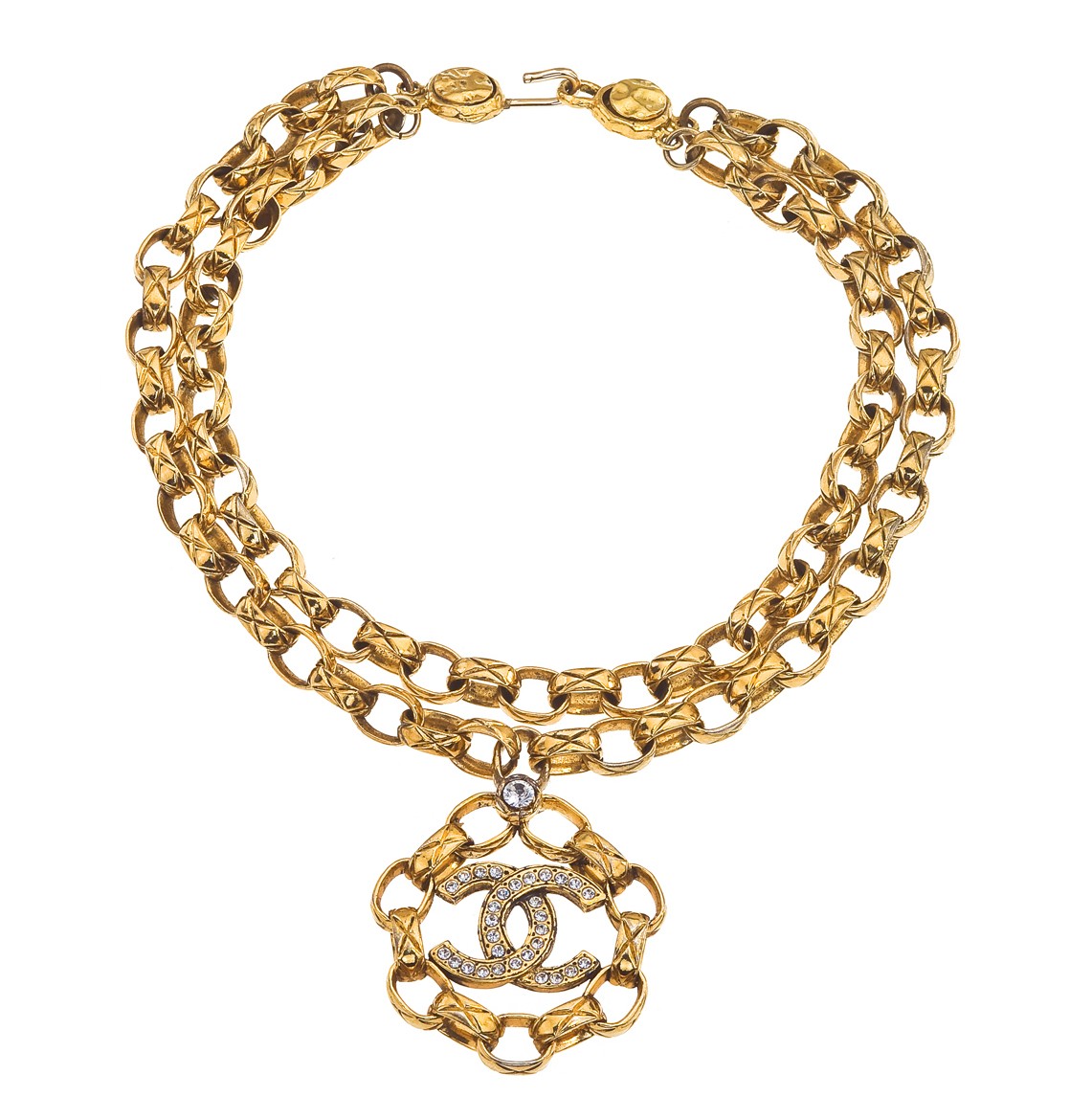 Description: Chanel large necklace with double chain with signature quilted details and CC logo with rhinestones.
